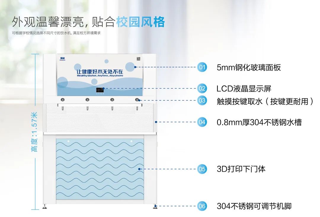 同时,结合学生饮水习惯,采用热交换技术,先烧开,后冷却,畅饮新鲜温开水,避免烫伤隐患;大通量多出水嘴供水,满足学生的集中取水需求,有效解决课间集中饮水供水不足等问题。