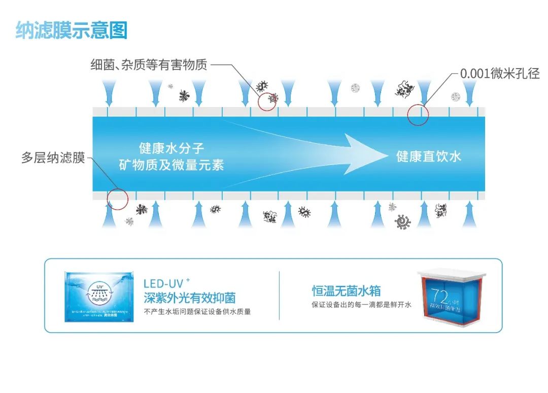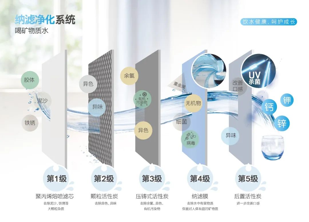 其采用五级精滤+LED-UV紫外灯抑菌技术,全方位保障饮水安全,甄选高品质纳滤膜,保留水中有益矿物质;滤芯更换及时提醒,实时保障饮水安全。