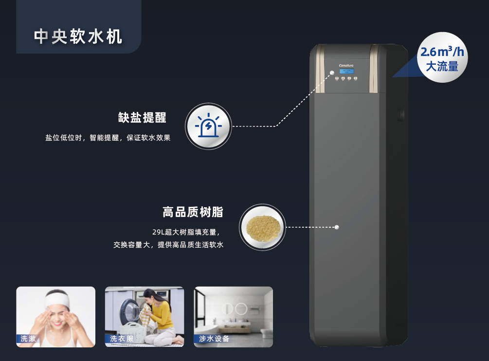 软水机的主要作用是吸附水中钙、镁离子,软化水质。软水可用于美容润肤、柔软衣物、保护居家涉水设备等,柔软的水质,带来舒适的体验,是居家高品质生活的所需。