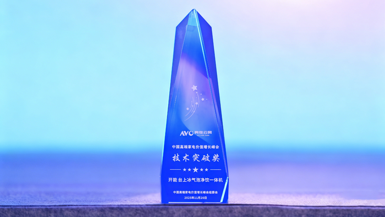 11月20日,在杭州举办的2025中国高端家电价值增长峰会上,开能健康科技集团股份有限公司(以下简称“开能健康”)旗下台上冰气泡净饮一体机,凭借创新技术集成与精妙设计,荣获“技术突破奖”。这一奖项不仅见证了开能的产品创新突破,更标志着其将二十余年水处理专业技术积淀,精准转化为高端家电领域的竞争优势。