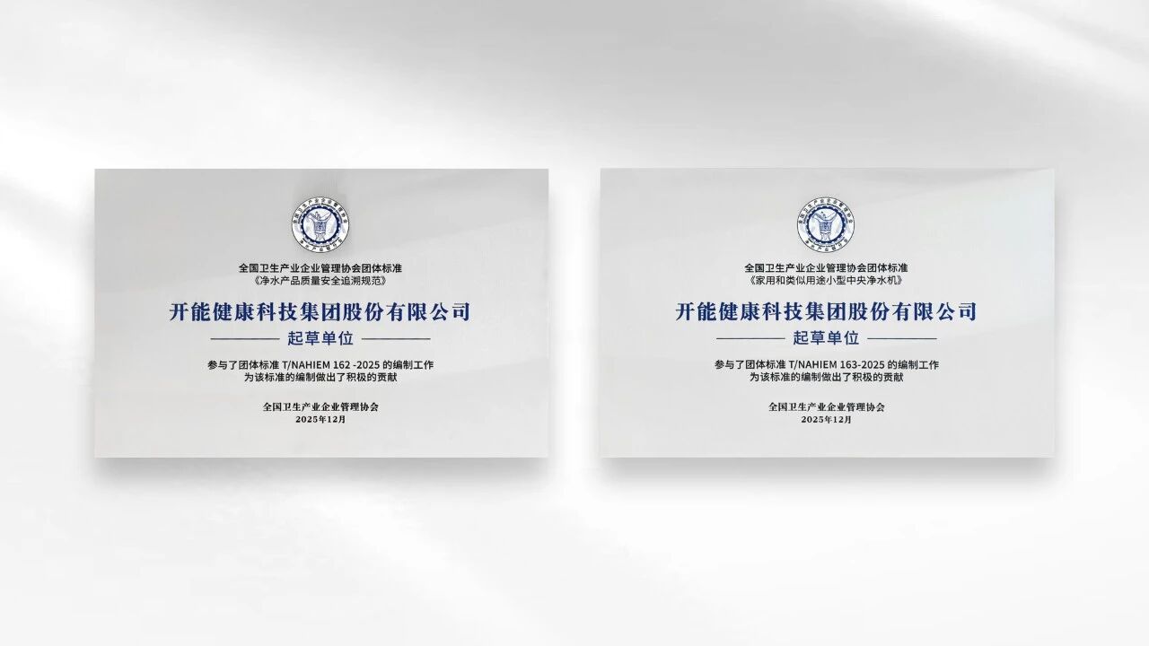 近日,全国卫生产业企业管理协会正式发布《净水产品质量安全追溯规范》与《家用和类似用途小型中央净水机》两项团体标准。开能健康科技集团股份有限公司(以下简称“开能健康”)作为起草单位深度参与标准制定,凭借25年技术沉淀与行业实践经验,为规范净水产品质量、推动行业标准化升级贡献关键力量。
