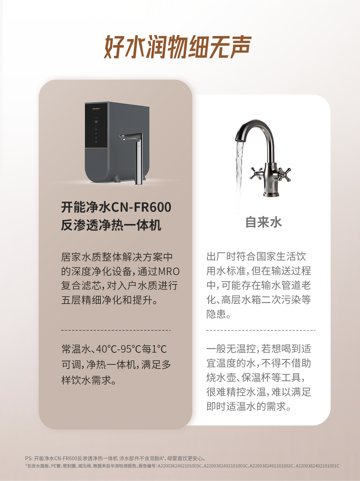 从清晨的第一杯暖饮,到夜里的一锅浓汤。开能净水 CN-FR600 以 “润物细无声” 的守护,将纯净与温暖融入生活的每一个瞬间。