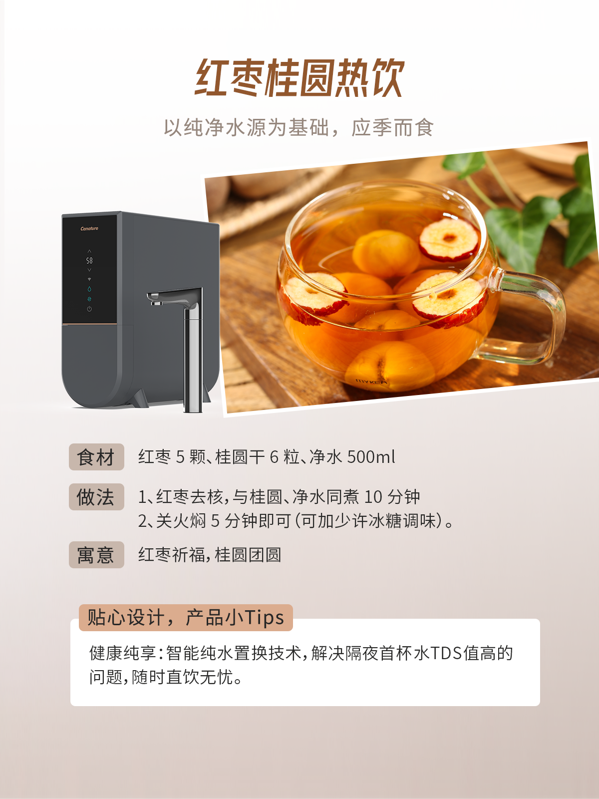 红枣去核,与桂圆干一同投入锅中,加入足量净化水慢煮十分钟,关火焖五分钟,清甜香气便漫满全屋。这杯 “红枣祈福,桂圆团圆” 的暖饮,是家人围坐时的甜蜜点缀,也是岁末辞旧的温情告白。