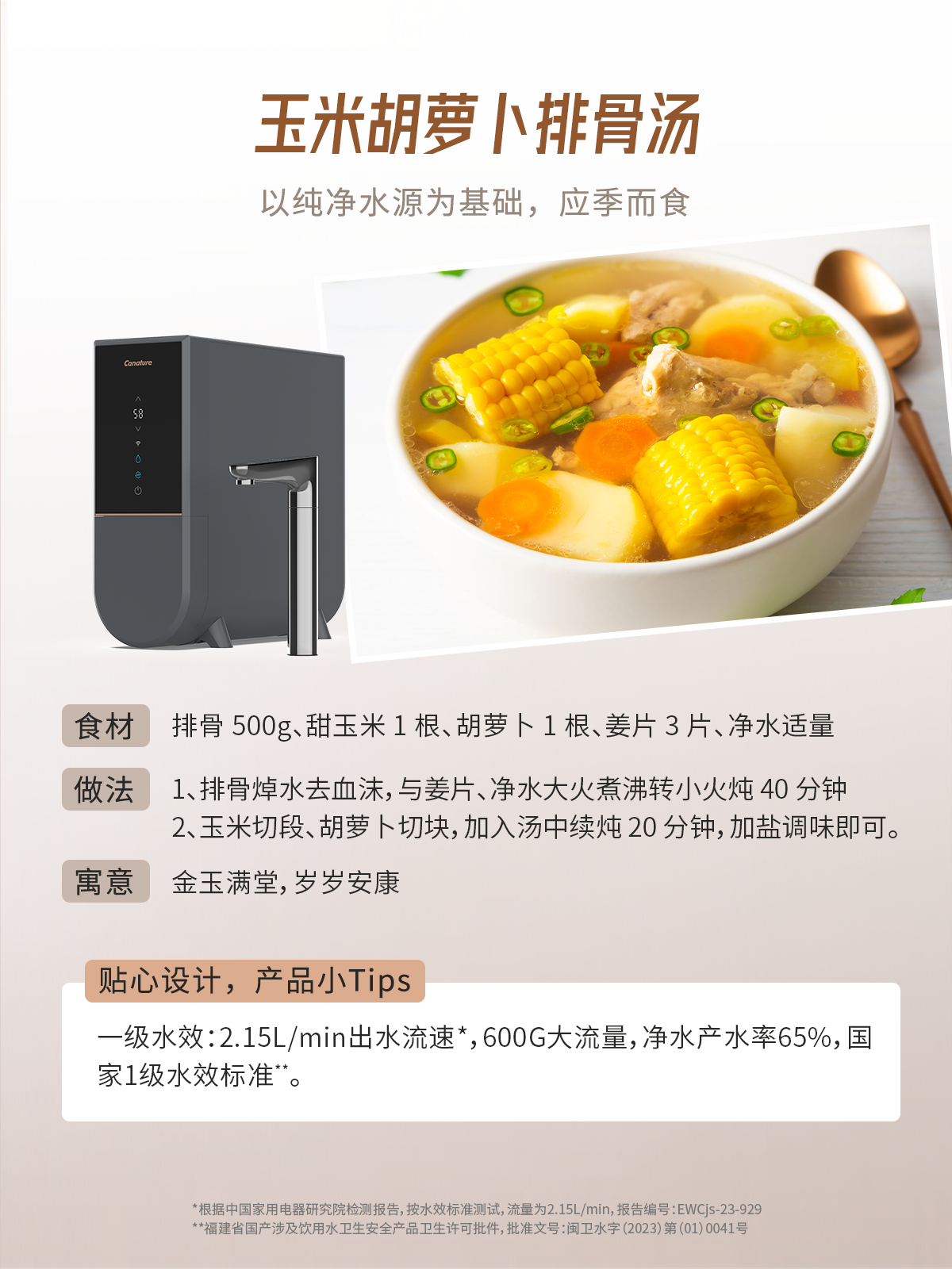岁末团圆宴,怎能少了一锅暖心汤?排骨焯水后,与姜片一同加入净化水大火煮沸,转小火慢炖四十分钟,再放入玉米、胡萝卜续炖二十分钟,汤色清亮,肉香混着蔬果香,这锅 “金玉满堂,岁岁安康” 的排骨汤,是纯净好水赋予团圆的鲜美滋味。